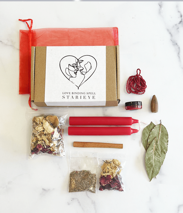 Ingredients: 2 candles, bath salts, red yarn, love herbs, honey, incense, red organza bag, dried roses and botanicals.